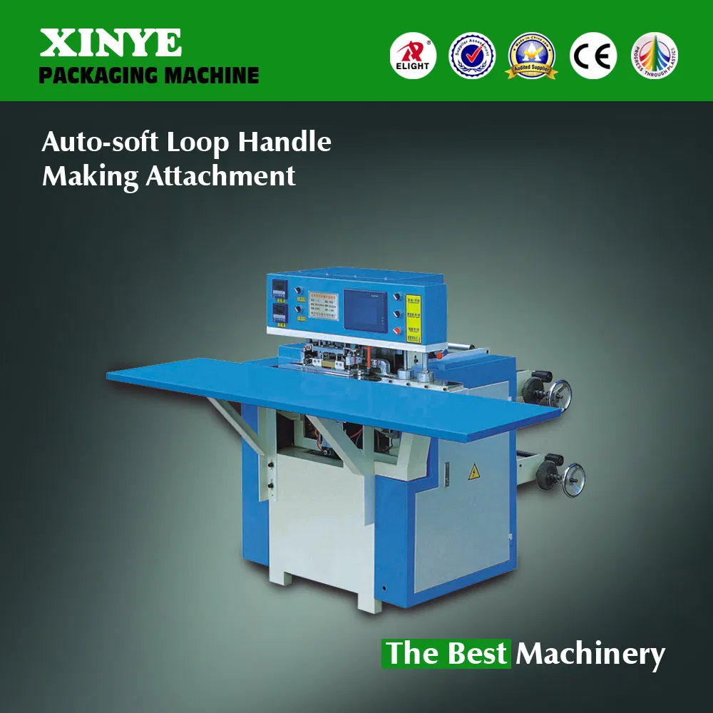 There is a shelf for affiliated material behind this machine. The width of the affiliated materials identical to the loop length, The affiliated material is cut into narrow trips, and fed into the top fold, The flexible handle film feeding system is feeding by motor, The rol of film is fed, cut and welded automatically and is precisely positioned to the centre of the carry bag.