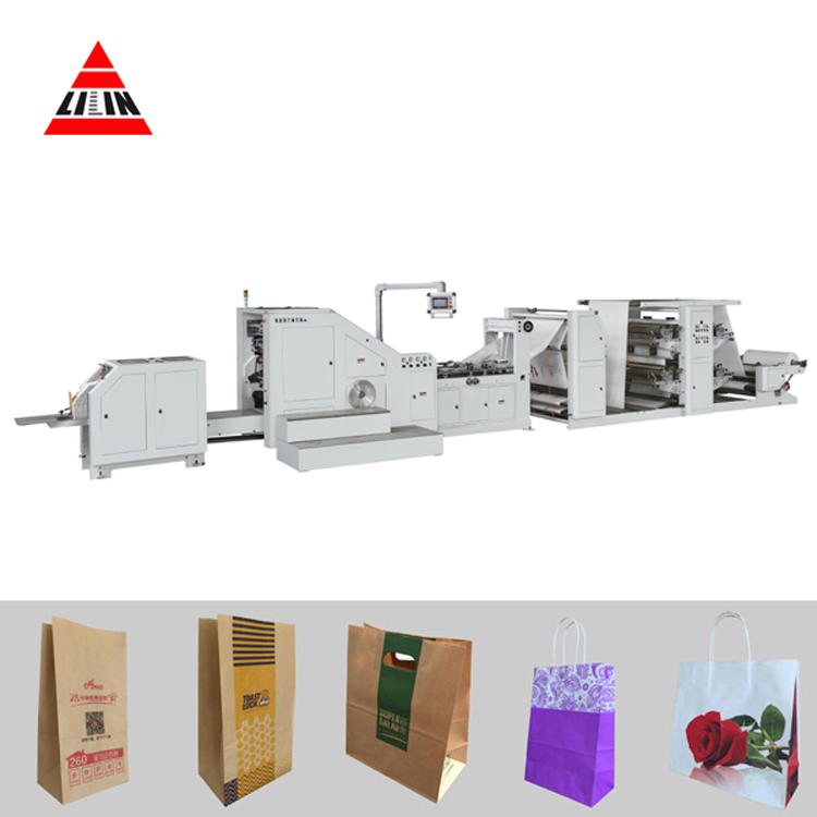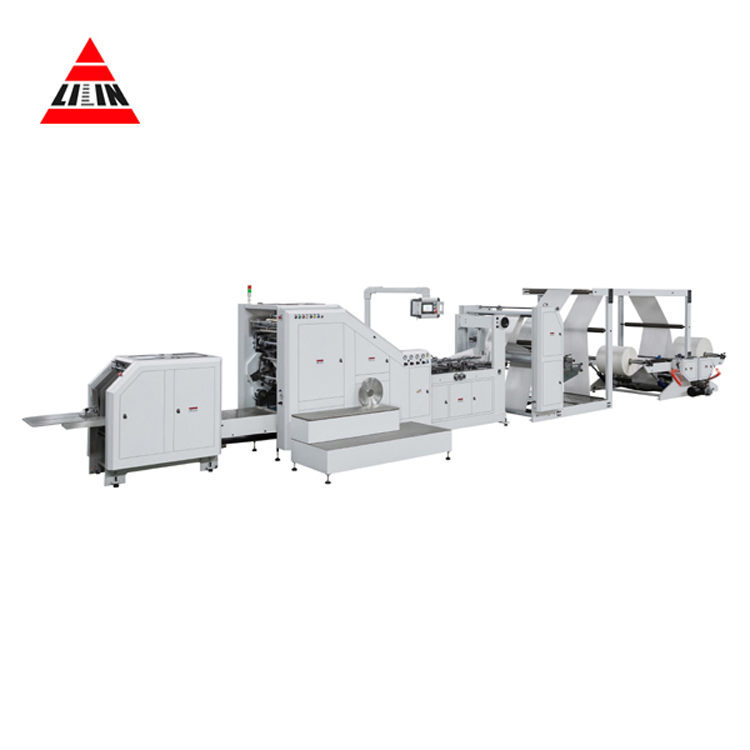 Roll Feeding square bottom paper bag making machine forming the paper bag in one process from printed or unprinted roll paper , side gluing, roll folding, roll paper cutting, bottom folding, bottom gluing, bottom forming, bag formation at a stroke. This machine controls by PC programmable servo motor through the human-machine touch screen interface. It can produce various of specifications paper bags. This machine have advantages of high speed, quickly replace the paper bag specifications, more wide range adjusting etc. It is an ideal machine for producing food bag, shopping handles bag.