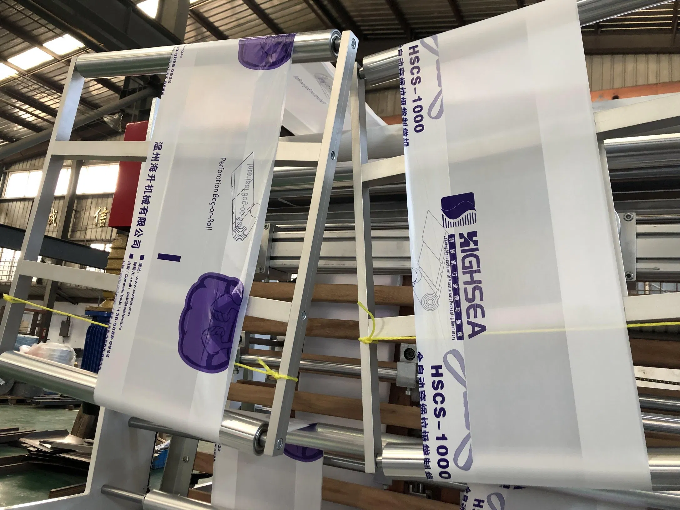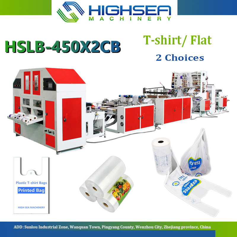 | HSLB-450X2CB Two Lines Fully Automatic T-shirt Bag-on-roll With Core Making Machine with gusset device |
