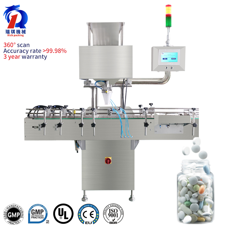 auto electronic pill counter machine ModelRQ-DSL-8DRQ-DSL-16RRQ-DSL-16Hsuit for Φ3~25mm tablets,pills,gummy,bean,buttons 000~5# hard and soft capsulesMax Capacity of auto drug pill counter50 bottle/min 80 bottles/min100 bottles/minAccuracy of auto drug pill counting counter and filler mach......