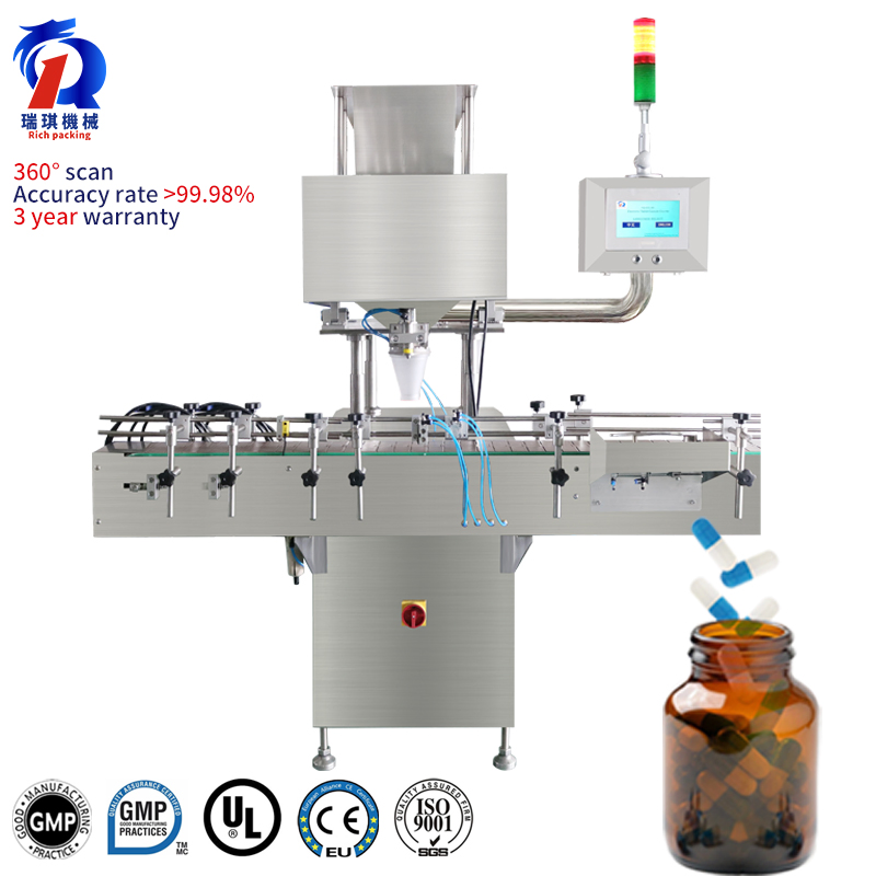 The RQ-DSL-8D electronic tablet counting machine: The electronic capsule counter is the counting and the filling equipment controlled by the PLC system. RQ-DSL-8D electronic tablet counting machine can scan and count by shaking the feeding slots, the photoelectric eye, and finally fill of RQ-DSL-8D electronic tablet counting machine from the feeding ports. The Photoelectric counter of RQ-DSL-8D electronic tablet counting machine is mainly used in the large scale, medium, and small scale pharmaceutical industry, the food-grade industry, in university the laboratory, and other fields. The visual counting machine can be used to counting capsules of various sizes (soft capsules or hard capsules), the tablets of various shapes, the candy of various shapes, and other materials.the Customer's dilemma: When using the automatic electronic counter, customers are faced with long-term difficulties in disassembly, installation, maintenance, and cleaning. Therefore, through long-term market research and more than 25 years of technology accumulation, the RQ-DSL-8D electronic tablet counting machine constantly updates and upgrades the products, and develops the latest models of the electronic counter. Compared with the outdated products from the other factories, this 8 lane model has made many technological innovations in modularization and intelligence.Photoelectric detection system: New type: using the one-to-one independent units, which means circuits are in parallel and do not affect each other.