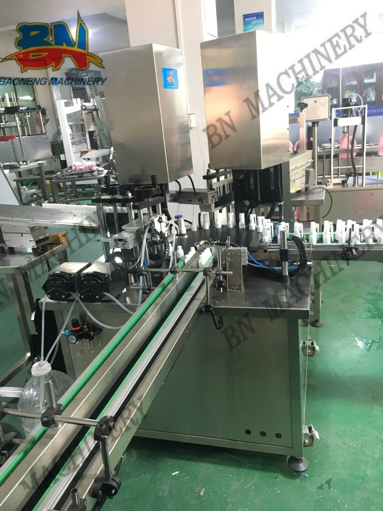 Automatic spray bottle filling capping production line fyi, with labor to feed caps (our other types view)