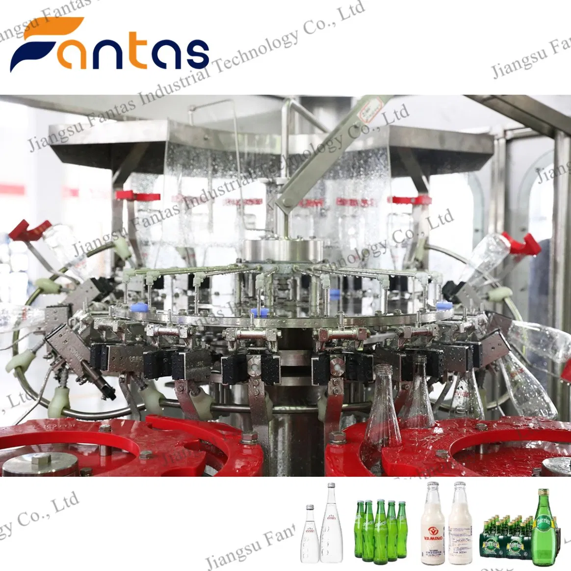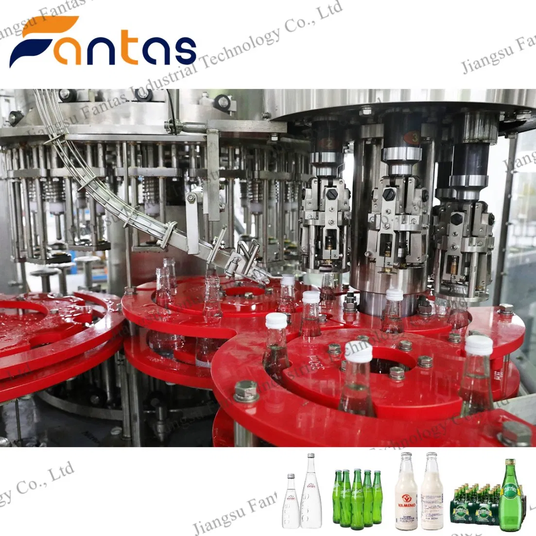 Our company introduces German technology, and uses the principle of equal pressure filling to design and manufacture by ourselves, so as to fill the liquid into the washed bottles sent by the bottle washing machine.The filling valve adopts constant pressure mechanical valve, which makes the filling quick and sensitive, with high precision of filling liquid level.It has the ability of vacuumizing, so that the oxygen content of the material can reach the minimum in the filling process. With double control of vacuum channel, filling valve has function of stopping vacuuming when there is no bottle.With the help of the guide rod, the automatic cylinder lifts the bottle, which can effectively form the seal between the bottle mouth and the filling valve.Due to the quality problem of glass bottle, the equipment is equipped with bottle explosion protection device. And there is a broken bottle washing, so as not to affect the next bottle.It has perfect CIP cleaning function.According to the different height of the bottle, it can achieve automatic lifting, with high and low position safety protection.The main drive adopts gear drive. It is also called open combination drive, with high efficiency, low noise, long service life, convenient maintenance and sufficient lubrication. Adopt frequency converter to control the speed of the main motor of the machine. And the machine adopts stepless frequency conversion to adjust speed.The conveying power of the bottle feeding section is provided by the main motor through the gear.The structure of the bottle guiding system is simple, and it can be changed quickly and conveniently according to the bottle type. The whole machine adopts the structure of supporting bottle bottom for conveying.The whole machine is controlled automatically by PLC. Faultsare displayed online, such as bottle blocking, cover lacking, etc.It has many safety protection functions. It won't open the valve and cover cap when there is no bottle. It will stop when there is no cap or when there is situation of door opened.The material in the filling cylinder is automatically controlled. The liquid level height is detected by the liquid level sensor to ensure the stability of liquid level and the reliability of filling.The key parts and electrical components of this machine are imported products.