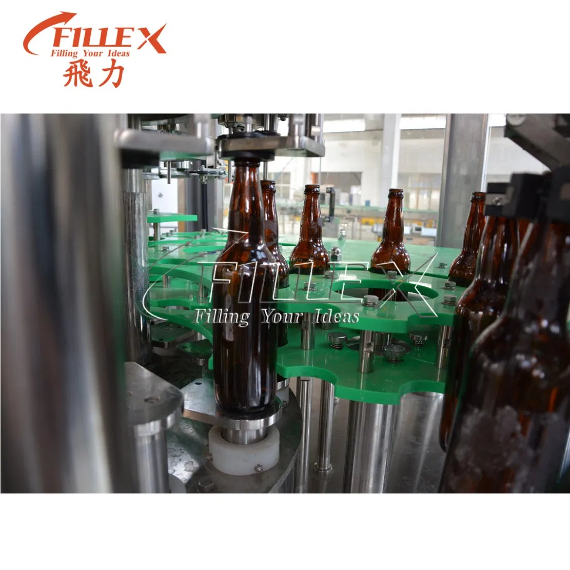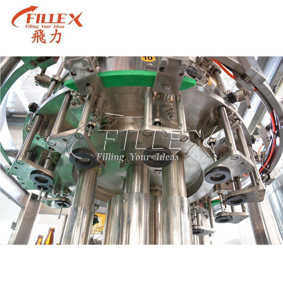 Glass Bottle Beer Filling Machine:This beer filling machinery is suitable for beer product, it is consist of filler capper or aluminum lid sealer, and sometimespeople also use one stage washer.The machine for glass bottle integrates the function of rinsing, filling and capping together. Based on advanced technology overseas, and designed according to filling processing demands of beer.Working Principle of Beer Bottling Machine Glass Bottle Beer Filling Machine:The bottle enters into the filling part of 3-in-1 machine through screw by convey chain. The filling valve acted by the cam can realize up and down. the filling valve opens and begins filling when it moves down and touches the bottleneck, the filling valve move up and leave the bottleneck when it finishes filling, the full bottle is transferred to the capping part through hold neck transition poking wheel. The guard plate holds bottle upright not rotating. The screw capping headkeeps in revolution and autorotation. It can finish a whole capping course including catching, pressing, screwing, discharging through the action of the cam. The full bottle is transferred to bottle outlet conveyor to the next process through poking wheel.