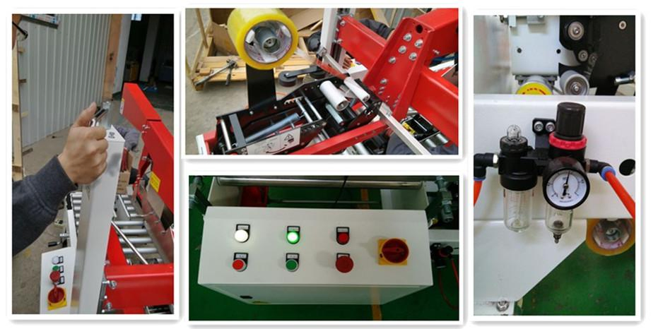 FXJ-AT5050 automatic folding carton sealer adopt left and right belt driving and pneumatic folding cover mechanism, Acme thread leadscrew adjustable mechanism for heigt and width, high strength structure, make the machine performance reliable, and can meet continuous heavy sealing work in the production line. Can manually adjust the sealing size for the same specifications carton sealing together.